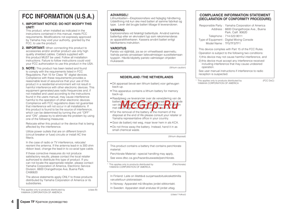Yamaha TF1 — краткое руководство по FCC для цифровых устройств класса B [4/36]