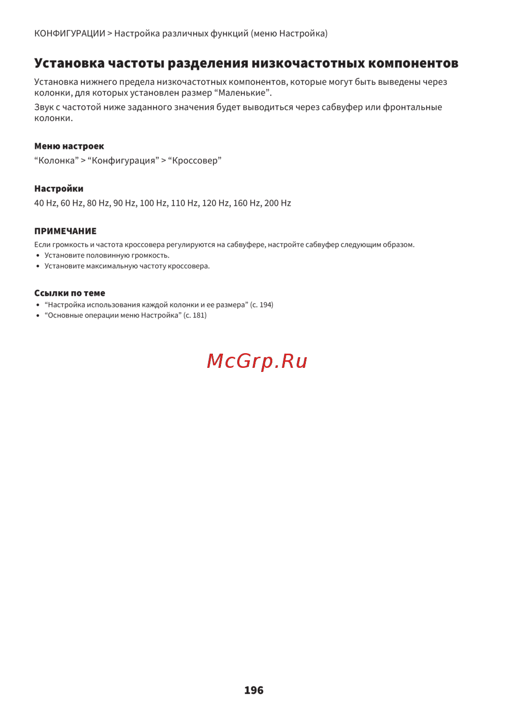 Звук с частотой ниже заданного значения будет выводиться через сабвуфер или фронтальные