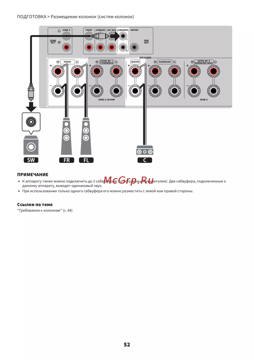 К аппарату также можно подключить до 2 сабвуферов (со встроенным усилителем). Два сабвуфера, подключенные к
