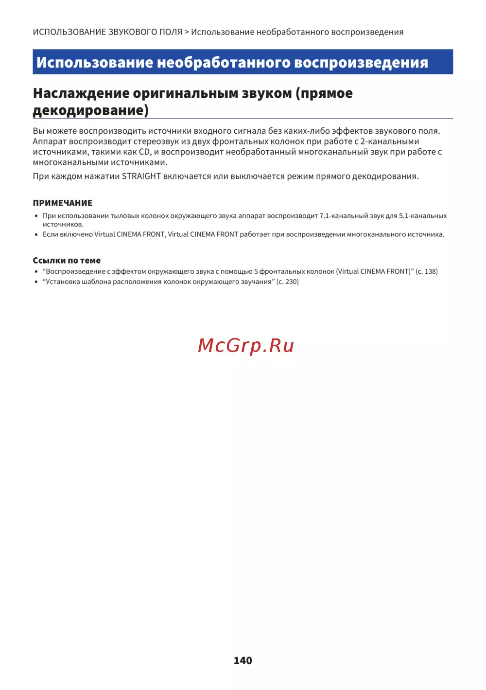 ИСПОЛЬЗОВАНИЕ ЗВУКОВОГО ПОЛЯ > Использование необработанного воспроизведения