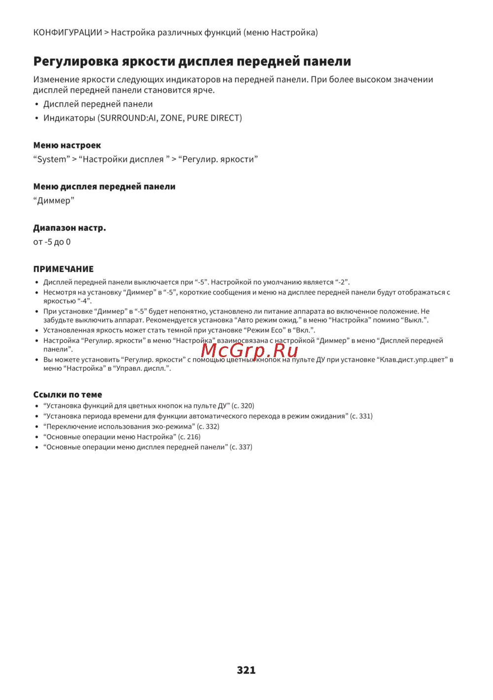 - Меню дисплей передней панели имеет следующие настройки по умолчанию p.446