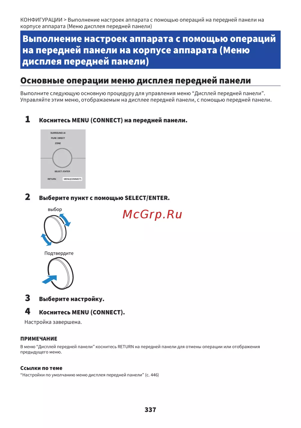 - Меню дисплей передней панели имеет следующие настройки по умолчанию p.446