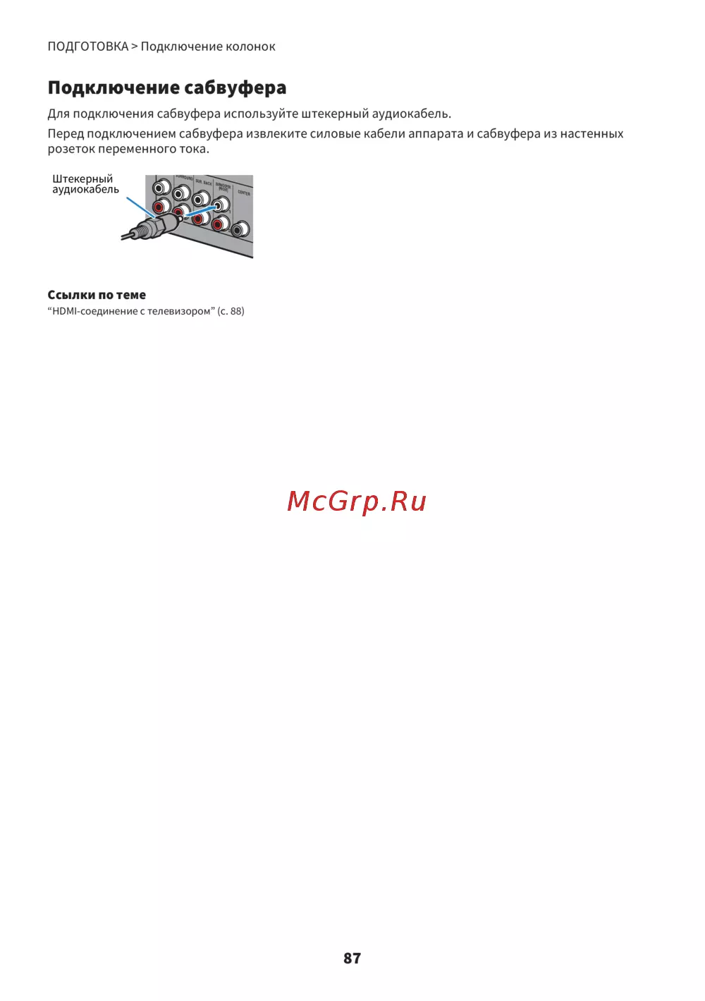 Для подключения сабвуфера используйте штекерный аудиокабель.