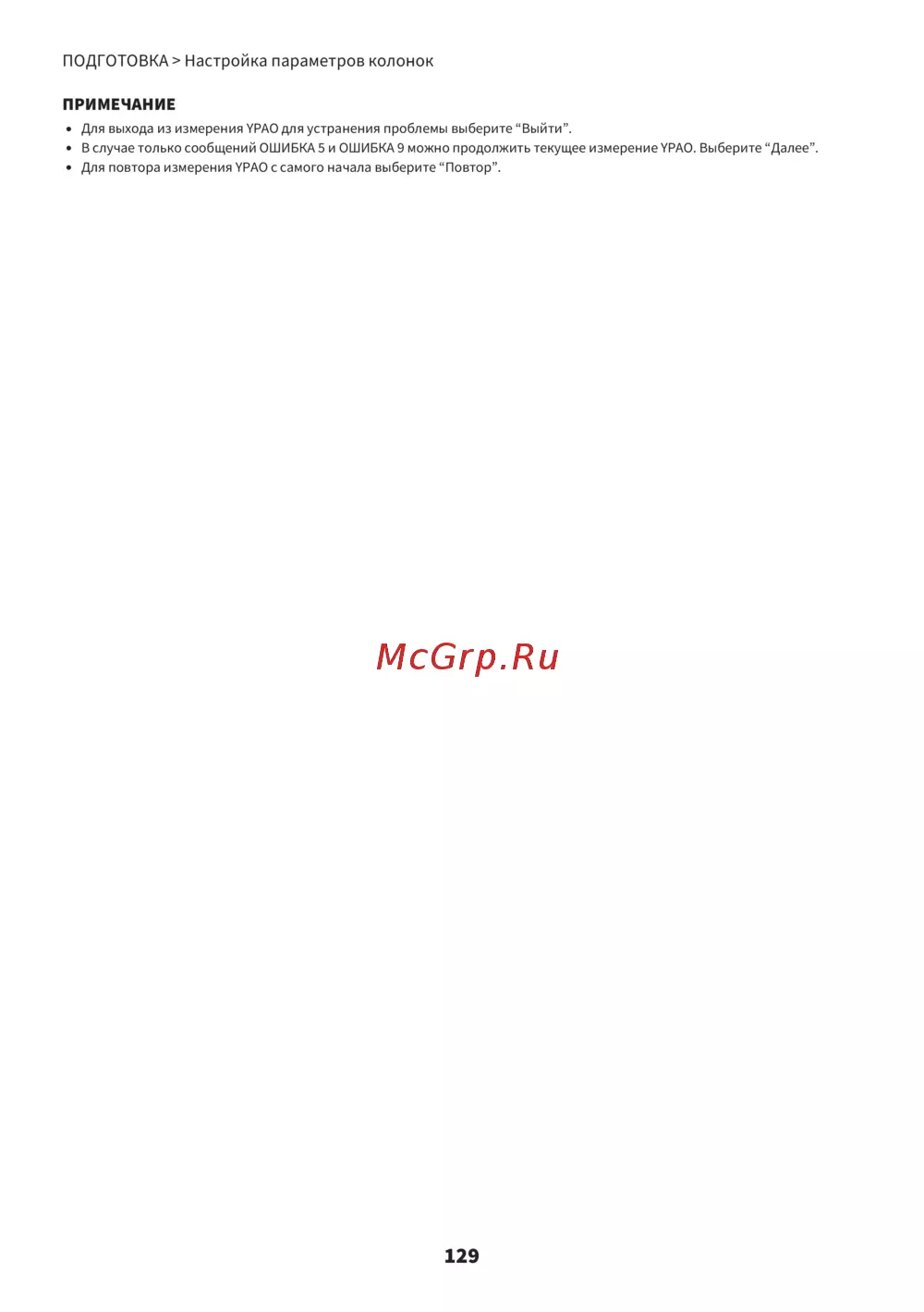 Для выхода из измерения YPAO для устранения проблемы выберите “Выйти”.