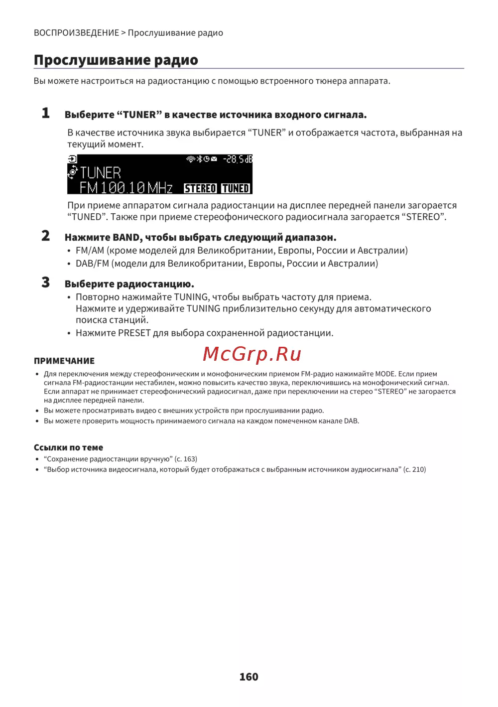 Вы можете настроиться на радиостанцию с помощью встроенного тюнера аппарата.