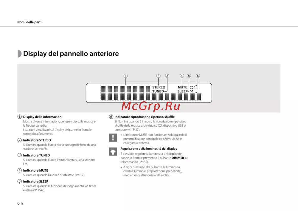 Scopri le funzioni del pannello anteriore e del display, inclusi indicatori di stato e regolazione della luminosità. Ottimizza la tua esperienza audio con queste informazioni.