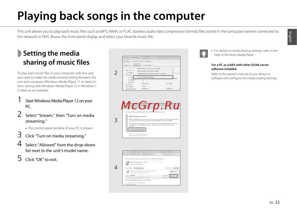 Узнайте, как воспроизводить музыкальные файлы с компьютера или NAS через сеть. Настройте совместное использование медиафайлов и наслаждайтесь любимой музыкой.