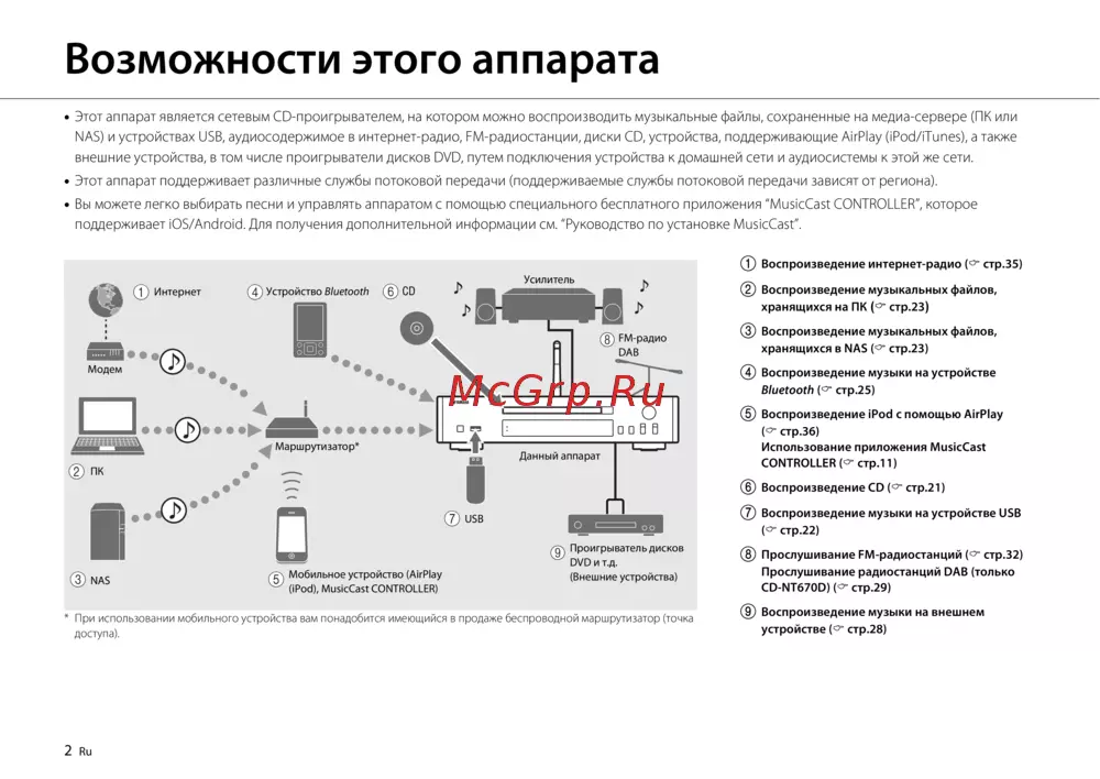 • Этот аппарат является сетевым CD-проигрывателем, на котором можно воспроизводить музыкальные файлы, сохраненные на медиа-сервере (ПК или