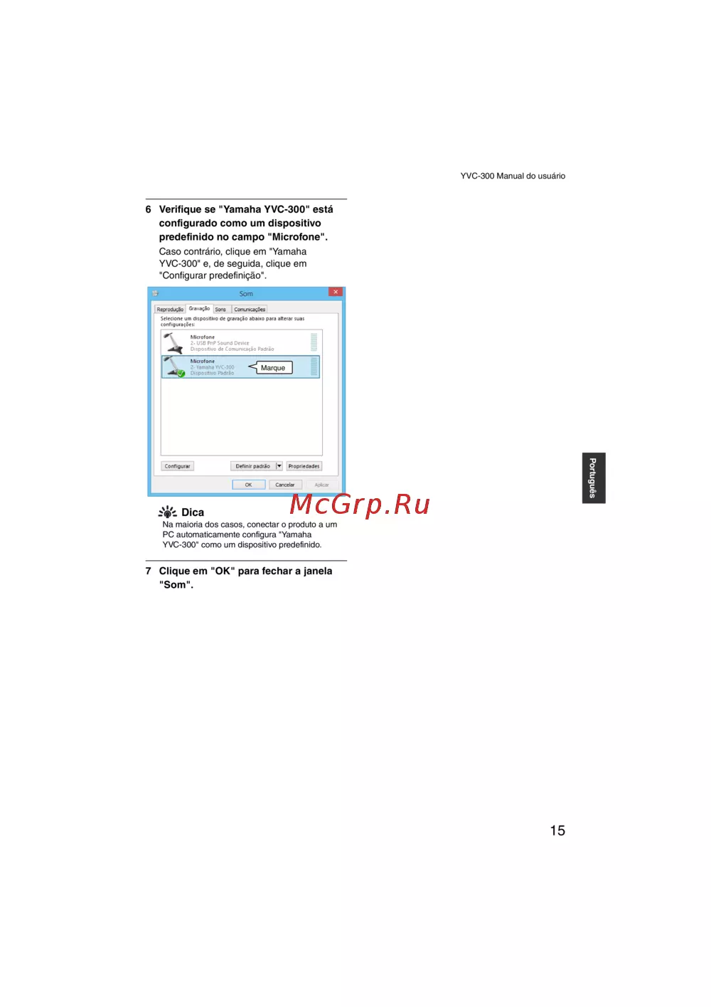 Yamaha YVC-300 [208/278] Verifique se yamaha yvc 300 está configurado como um dispositivo predefinido no campo microfone