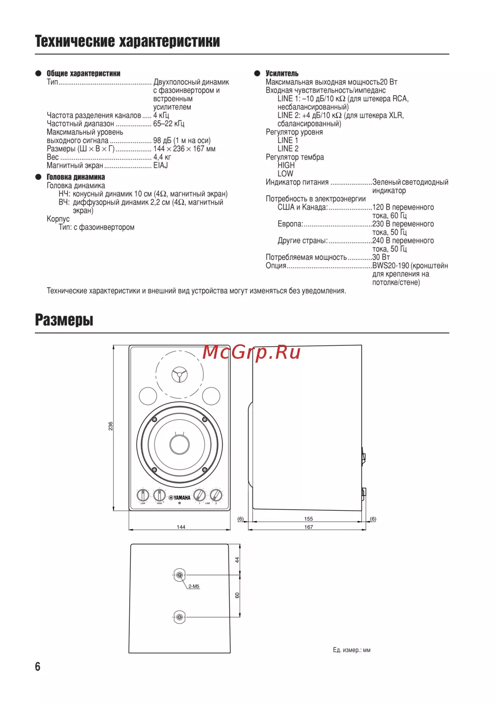 Технические характеристики Общие характеристики Тип Двухполосный динамик сфазоинвертором и встроенным усилителем Частота разделения каналов 4 кГц Частотный диапазон 65 22 кГц Максимальный уровень выходного сигнала 98 дБ 1 мна оси Размеры Ш х В х Г 144 х 236х 167 мм Вес 4 4 кг Магнитный экран Е АЗ Усилитель Максимальная выходная мощность20 Вт Входная чувствительность импеданс LINE 1 10 дБ 10 KQ ДЛЯ штекера RCA несбалансированный LINE 2 4 дБ 10 KQ ДЛЯ штекера XLR сбалансированный Регулятор уровня LINEI LINE 2 Регулятор тембра HIGH LOW Головка динамика Индикатор питания Зеленый светодиодный Головка динамика индикатор НЧ конусный динамик 10 см 4Л магнитный экран Потребность в электроэнергии ВЧ диффузорный динамик 2 2 см 4 2 магнитный США и Канада 120 В переменного экран тока 60 Гц Корпус Европа 230 В переменного Тип сфазоинвертором тока 50 Гц Другие страны 240 В переменного тока 50 Гц Потребляемая мощность 30 Вт Опция BWS20 190 кронштейн для крепления на потолке стене Технические характеристики и внешний вид устройства могут изменяться без уведомления Размеры