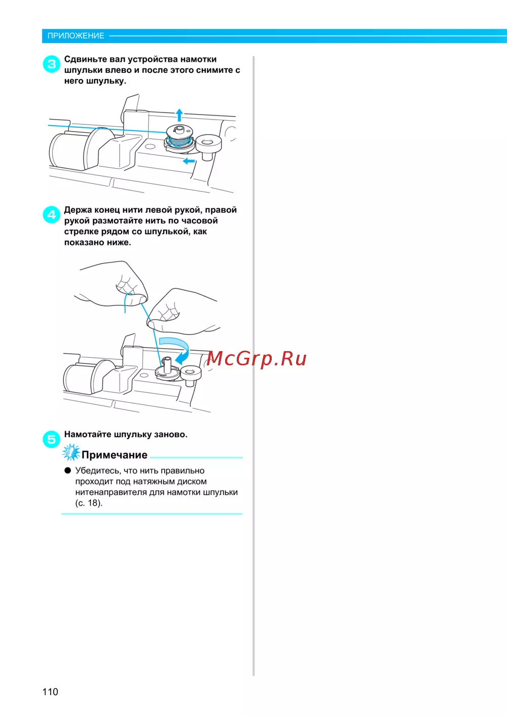 - При замедлении намотки шпульки остановите машину в противном случае возможно ее повреждение p.21