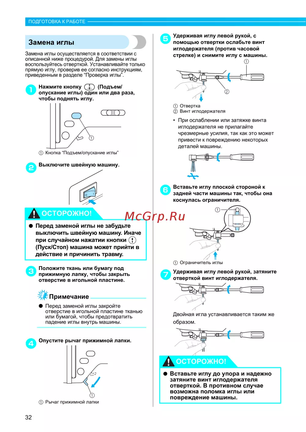 - После настройки ширины строчки медленно поверните маховик на себя против часовой стрелки и убедитесь в том что игла не касается прижимной лапки если игла ударит по лапке она может погнуться или сломаться p.92