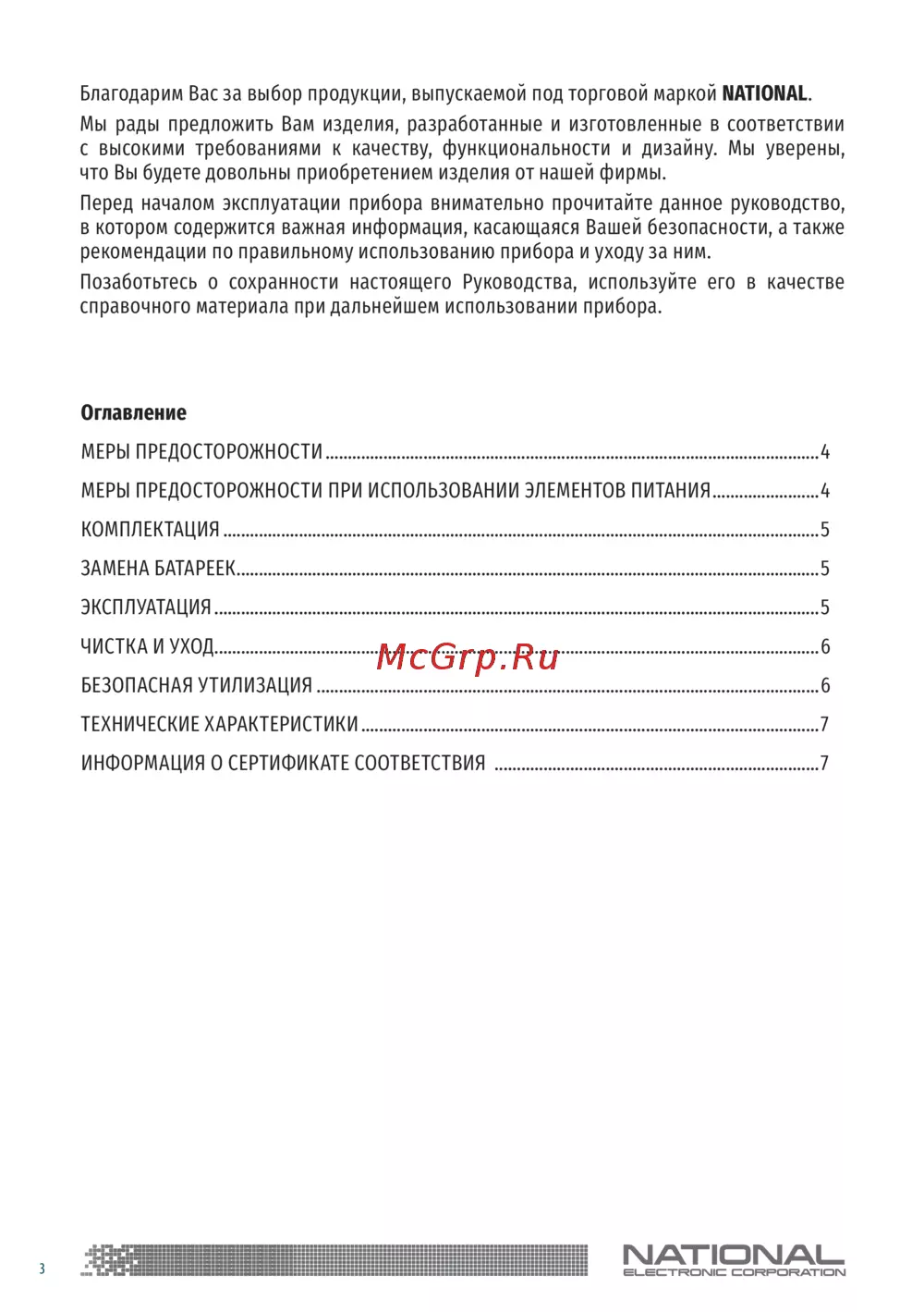 Благодарим Вас за выбор продукции, выпускаемой под торговой маркой NATIONAL.