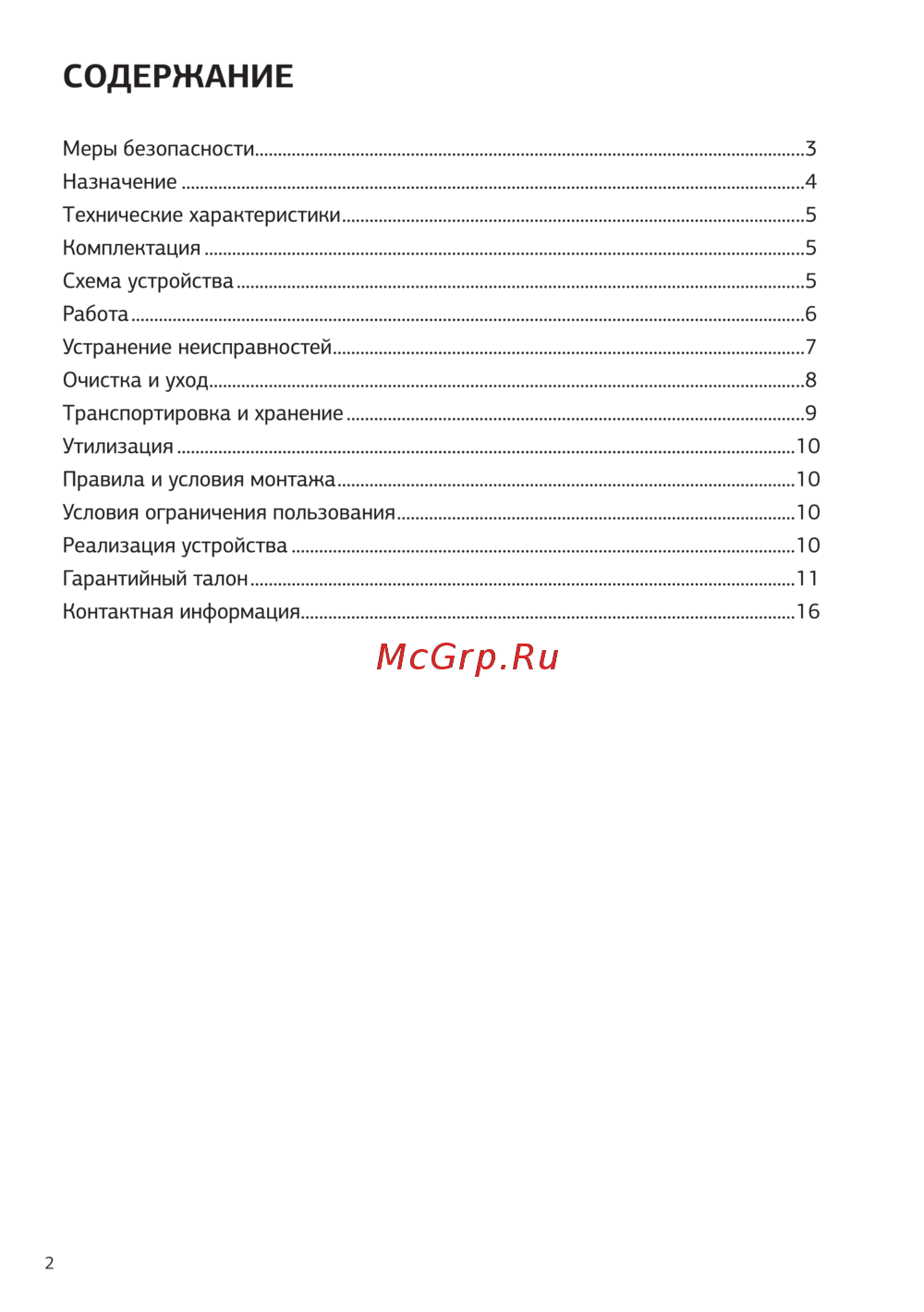 СОДЕРЖАНИЕ Меры безопасности 3 Назначение 4 Технические характеристики 5 Комплектация 5 Схема устройства 5 Работа 6 Устранение неисправностей 7 Очистка и уход 8 Транспортировка и хранение 9 Утилизация 10 Правила и условия монтажа 10 Условия ограничения пользования 10 Реализация устройства 10 Гарантийный талон 11 Контактная информация 16 2