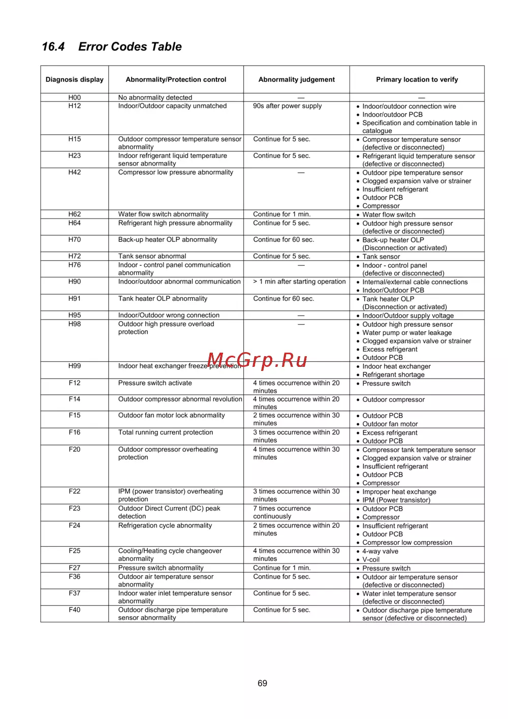 Panasonic WH-SDF12C9E8 [69/125] Error codes table