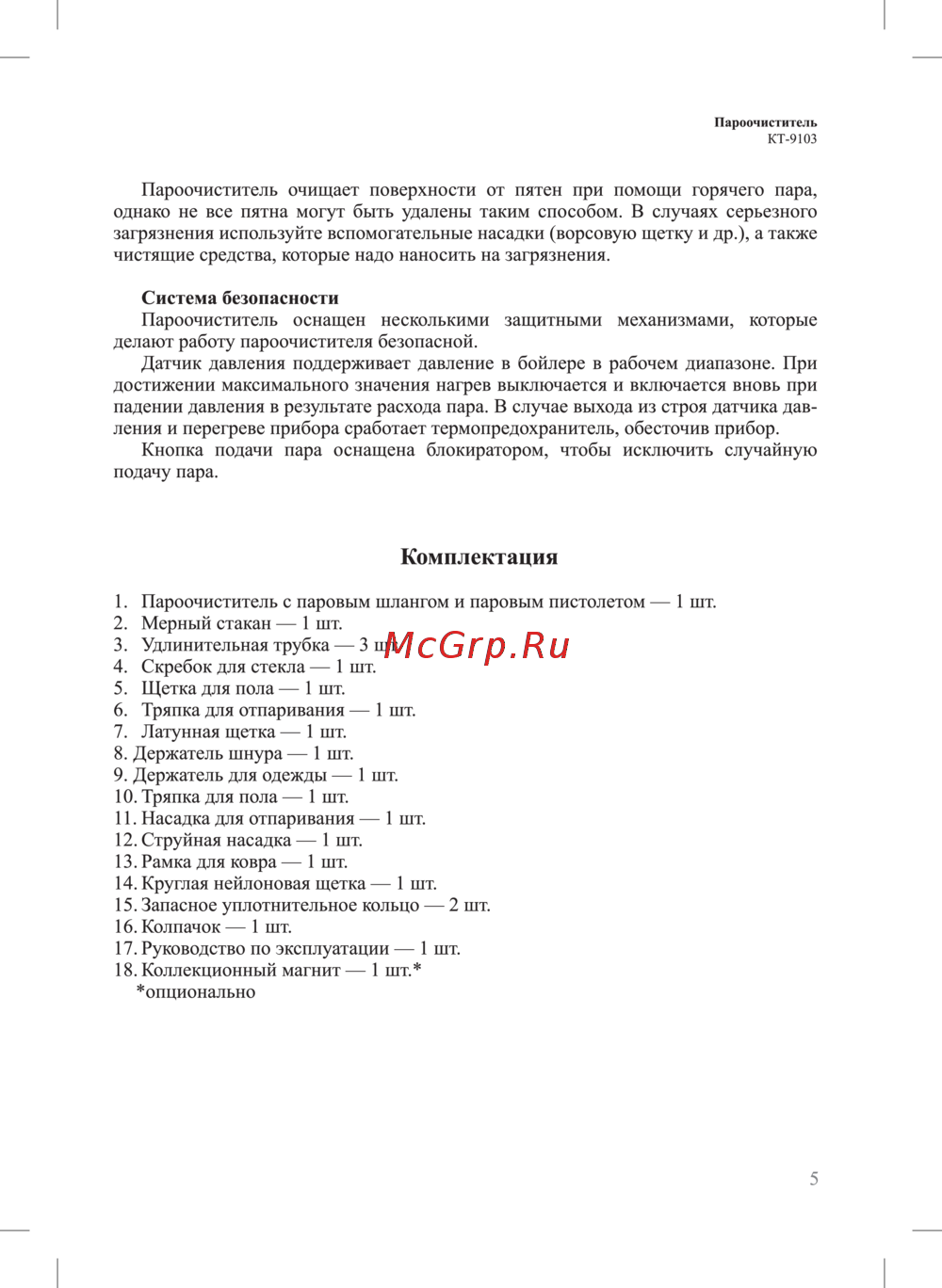 Пароочиститель КТ 9103 Пароочиститель очищает поверхности от пятен при помощи горячего пара однако не все пятна могут быть удалены таким способом В случаях серьезного загрязнения используйте вспомогательные насадки ворсовую щетку и др а также чистящие средства которые надо наносить на загрязнения Система безопасности Пароочиститель оснащен несколькими защитными механизмами которые делают работу пароочистителя безопасной Датчик давления поддерживает давление в бойлере в рабочем диапазоне При достижении максимального значения нагрев выключается и включается вновь при падении давления в результате расхода пара В случае выхода из строя датчика дав ления и перегреве прибора сработает термопредохранитель обесточив прибор Кнопка подачи пара оснащена блокиратором чтобы исключить случайную подачу пара Комплектация 1 Пароочиститель с паровым шлангом и паровым пистолетом 1 шт 2 Мерный стакан 1 шт 3 Удлинительная трубка 3 шт 4 Скребок для стекла 1 шт 5 Щетка для пола 1 шт 6 Тряпка для отпаривания 1 шт 7 Латунная щетка 1 шт 8 Держатель шнура 1 шт 9 Держатель для одежды 1 шт 10 Тряпка для пола 1 шт 11 Насадка для отпаривания 1 шт 12 Струйная насадка 1 шт 13 Рамка для ковра 1 шт 14 Круглая нейлоновая щетка 1 шт 15 Запасное уплотнительное кольцо 2 шт 16 Колпачок 1 шт 17 Руководство по эксплуатации 1 шт 18 Коллекционный магнит 1 шт Опционально 5
