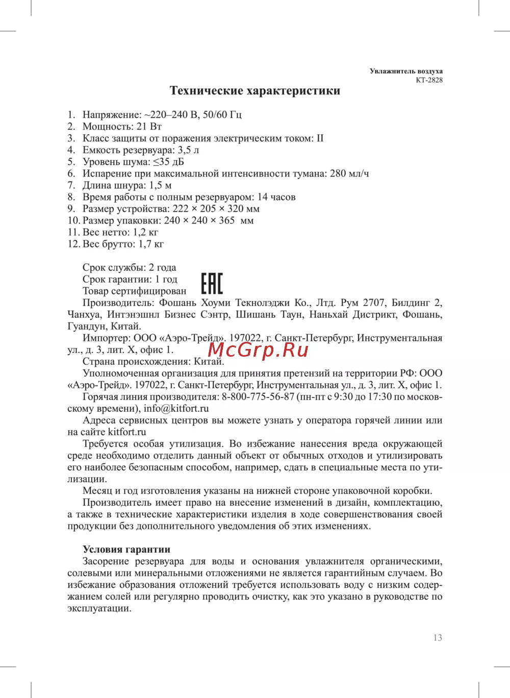Увлажнитель воздуха КТ 2828 Технические характеристики 1 Напряжение 220 240 В 50 60 Гц 2 Мощность 21 Вт 3 Класс защиты от поражения электрическим током II 4 Емкость резервуара 3 5 л 5 Уровень шума 35 дБ 6 Испарение при максимальной интенсивности тумана 280 мл ч 7 Длина шнура 1 5 м 8 Время работы с полным резервуаром 14 часов 9 Размер устройства 222 х 205 х 320 мм 10 Размер упаковки 240 х 240 х 365 мм 11 Вес нетто 1 2 кг 12 Вес брутто 1 7 кг Срок службы 2 года Срок гарантии 1 год ГПГ Товар сертифицирован 111 к Производитель Фошань Хоуми Текнолэджи Ко Лтд Рум 2707 Билдинг 2 Чанхуа Интэнэшнл Бизнес Сэнтр Шишань Таун Наньхай Дистрикт Фошань Гуандун Китай Импортер ООО Аэро Трейд 197022 г Санкт Петербург Инструментальная ул д 3 лит X офис 1 Страна происхождения Китай Уполномоченная организация для принятия претензий на территории РФ ООО Аэро Трейд 197022 г Санкт Петербург Инструментальная ул д 3 лит X офис 1 Горячая линия производителя 8 800 775 56 87 пн птс 9 30 до 17 30 по москов скому времени info kitfort ru Адреса сервисных центров вы можете узнать у оператора горячей линии или на сайте kitfort ru Требуется особая утилизация Во избежание нанесения вреда окружающей среде необходимо отделить данный объект от обычных отходов и утилизировать его наиболее безопасным способом например сдать в специальные места по ути лизации Месяц и год изготовления указаны на нижней стороне упаковочной коробки Производитель имеет право на внесение изменений в дизайн комплектацию а также в технические характеристики изделия в ходе совершенствования своей продукции без дополнительного уведомления об этих изменениях Условия гарантии Засорение резервуара для воды и основания увлажнителя органическими солевыми или минеральными отложениями не является гарантийным случаем Во избежание образования отложений требуется использовать воду с низким содер жанием солей или регулярно проводить очистку как это указано в руководстве по эксплуатации 13
