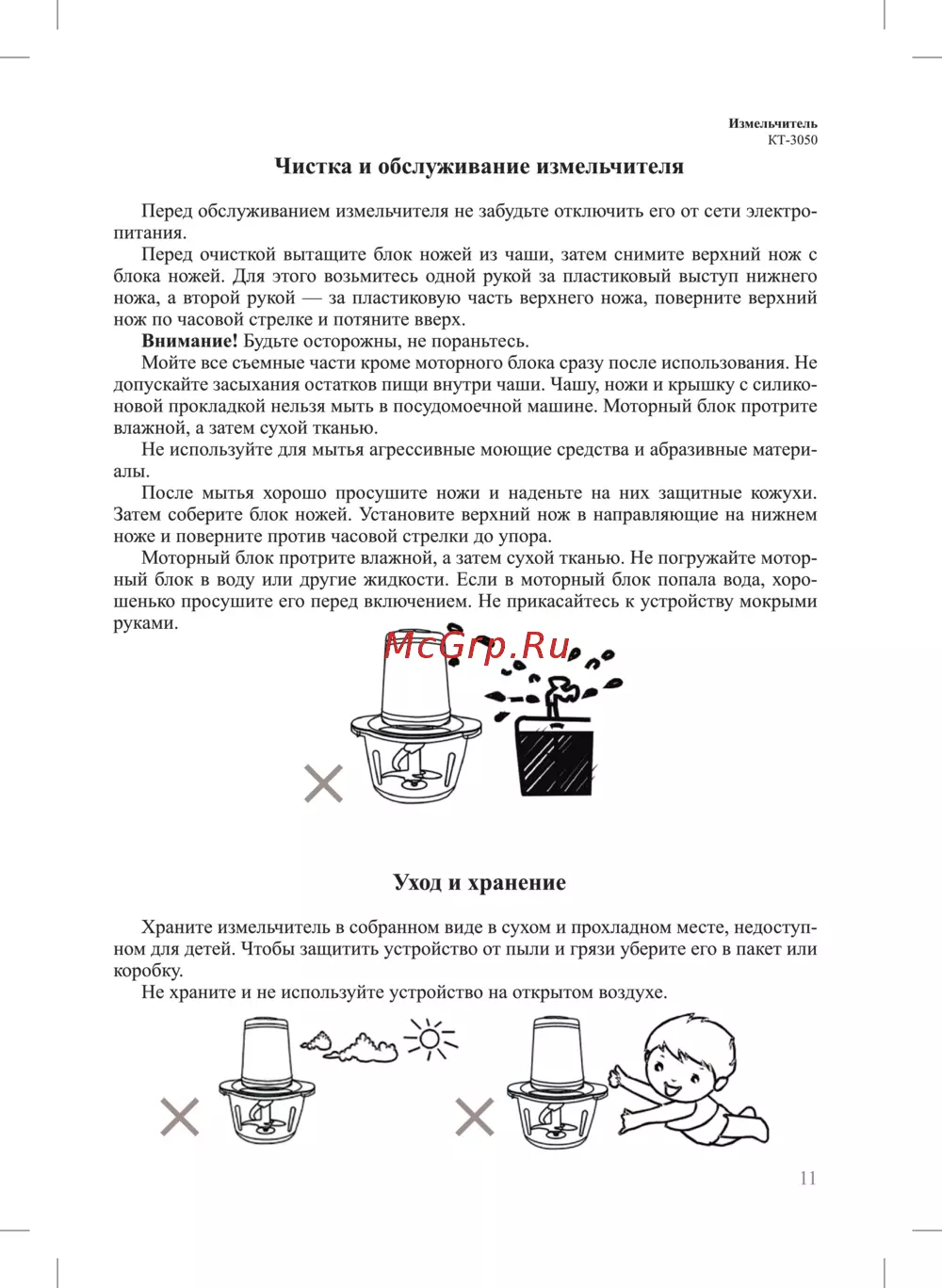 Измельчитель КТ 3050 Чистка и обслуживание измельчителя Перед обслуживанием измельчителя не забудьте отключить его от сети электро питания Перед очисткой вытащите блок ножей из чаши затем снимите верхний нож с блока ножей Для этого возьмитесь одной рукой за пластиковый выступ нижнего ножа а второй рукой за пластиковую часть верхнего ножа поверните верхний нож по часовой стрелке и потяните вверх Внимание Будьте осторожны не пораньтесь Мойте все съемные части кроме моторного блока сразу после использования Не допускайте засыхания остатков пищи внутри чаши Чашу ножи и крышку с силико новой прокладкой нельзя мыть в посудомоечной машине Моторный блок протрите влажной а затем сухой тканью Не используйте для мытья агрессивные моющие средства и абразивные матери алы После мытья хорошо просушите ножи и наденьте на них защитные кожухи Затем соберите блок ножей Установите верхний нож в направляющие на нижнем ноже и поверните против часовой стрелки до упора Моторный блок протрите влажной а затем сухой тканью Не погружайте мотор ный блок в воду или другие жидкости Если в моторный блок попала вода хоро шенько просушите его перед включением Не прикасайтесь к устройству мокрыми руками Уход и хранение Храните измельчитель в собранном виде в сухом и прохладном месте недоступ ном для детей Чтобы защитить устройство от пыли и грязи уберите его в пакет или коробку Не храните и не используйте устройство на открытом воздухе И
