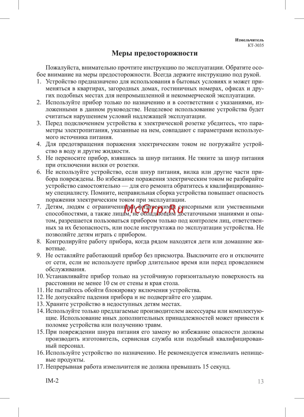 Измельчитель КТ 3035 Меры предосторожности Пожалуйста внимательно прочтите инструкцию по эксплуатации Обратите осо бое внимание на меры предосторожности Всегда держите инструкцию под рукой 1 Устройство предназначено для использования в бытовых условиях и может при меняться в квартирах загородных домах гостиничных номерах офисах и дру гих подобных местах для непромышленной и некоммерческой эксплуатации 2 Используйте прибор только по назначению и в соответствии с указаниями из ложенными в данном руководстве Нецелевое использование устройства будет считаться нарушением условий надлежащей эксплуатации 3 Перед подключением устройства к электрической розетке убедитесь что пара метры электропитания указанные на нем совпадают с параметрами используе мого источника питания 4 Для предотвращения поражения электрическим током не погружайте устрой ство в воду и другие жидкости 5 Не переносите прибор взявшись за шнур питания Не тяните за шнур питания при отключении вилки от розетки 6 Не используйте устройство если шнур питания вилка или другие части при бора повреждены Во избежание поражения электрическим током не разбирайте устройство самостоятельно для его ремонта обратитесь к квалифицированно му специалисту Помните неправильная сборка устройства повышает опасность поражения электрическим током при эксплуатации 7 Детям людям с ограниченными физическими сенсорными или умственными способностями а также лицам не обладающим достаточными знаниями и опы том разрешается пользоваться прибором только под контролем лиц ответствен ных за их безопасность или после инструктажа по эксплуатации устройства Не позволяйте детям играть с прибором 8 Контролируйте работу прибора когда рядом находятся дети или домашние жи вотные 9 Не оставляйте работающий прибор без присмотра Выключите его и отключите от сети если не используете прибор длительное время или перед проведением обслуживания 10 Устанавливайте прибор только на устойчивую горизонтальную поверхность на расстоянии не менее 10 см от стены и края стола 11 Не пытайтесь обойти блокировку включения устройства 12 Не допускайте падения прибора и не подвергайте его ударам 13 Храните устройство в недоступных детям местах 14 Используйте только предлагаемые производителем аксессуары или комплектую щие Использование иных дополнительных принадлежностей может привести к поломке устройства или получению травм 15 При повреждении шнура питания его замену во избежание опасности должны производить изготовитель сервисная служба или подобный квалифицирован ный персонал 16 Используйте устройство по назначению Не рекомендуется измельчать непище вые продукты 17 Непрерывная работа измельчителя не должна превышать 15 секунд 1М 2 13