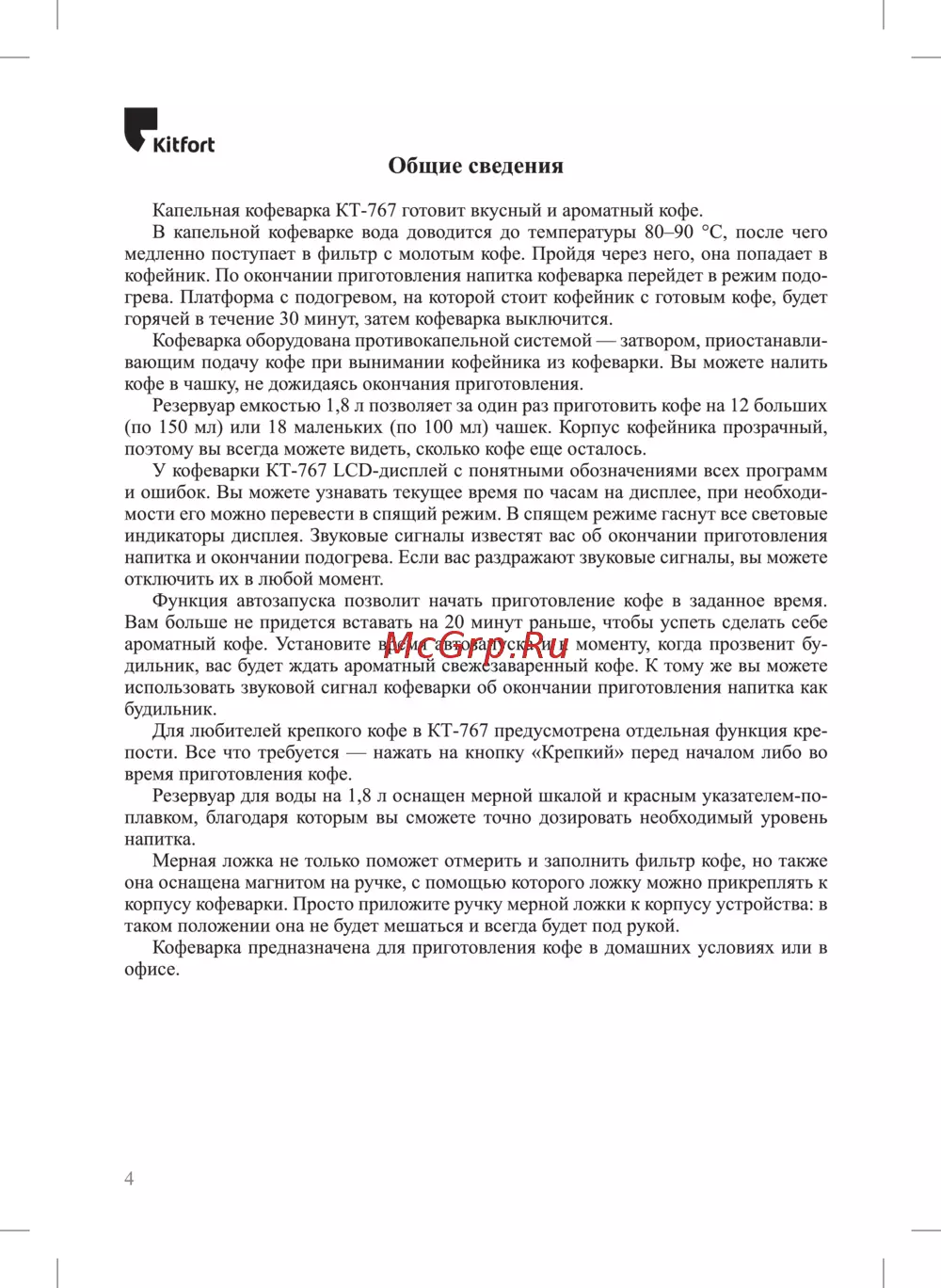Kitfort Общие сведения Капельная кофеварка КТ 767 готовит вкусный и ароматный кофе В капельной кофеварке вода доводится до температуры 80 90 C после чего медленно поступает в фильтр с молотым кофе Пройдя через него она попадает в кофейник По окончании приготовления напитка кофеварка перейдет в режим подо грева Платформа с подогревом на которой стоит кофейник с готовым кофе будет горячей в течение 30 минут затем кофеварка выключится Кофеварка оборудована противокапельной системой затвором приостанавли вающим подачу кофе при вынимании кофейника из кофеварки Вы можете налить кофе в чашку не дожидаясь окончания приготовления Резервуар емкостью 1 8 л позволяет за один раз приготовить кофе на 12 больших по 150 мл или 18 маленьких по 100 мл чашек Корпус кофейника прозрачный поэтому вы всегда можете видеть сколько кофе еще осталось У кофеварки КТ 767 LCD дисплей с понятными обозначениями всех программ и ошибок Вы можете узнавать текущее время по часам на дисплее при необходи мости его можно перевести в спящий режим В спящем режиме гаснут все световые индикаторы дисплея Звуковые сигналы известят вас об окончании приготовления напитка и окончании подогрева Если вас раздражают звуковые сигналы вы можете отключить их в любой момент Функция автозапуска позволит начать приготовление кофе в заданное время Вам больше не придется вставать на 20 минут раньше чтобы успеть сделать себе ароматный кофе Установите время автозапуска и к моменту когда прозвенит бу дильник вас будет ждать ароматный свежезаваренный кофе К тому же вы можете использовать звуковой сигнал кофеварки об окончании приготовления напитка как будильник Для любителей крепкого кофе в КТ 767 предусмотрена отдельная функция кре пости Все что требуется нажать на кнопку Крепкий перед началом либо во время приготовления кофе Резервуар для воды на 1 8 л оснащен мерной шкалой и красным указателем по плавком благодаря которым вы сможете точно дозировать необходимый уровень напитка Мерная ложка не только поможет отмерить и заполнить фильтр кофе но также она оснащена магнитом на ручке с помощью которого ложку можно прикреплять к корпусу кофеварки Просто приложите ручку мерной ложки к корпусу устройства в таком положении она не будет мешаться и всегда будет под рукой Кофеварка предназначена для приготовления кофе в домашних условиях или в офисе 4