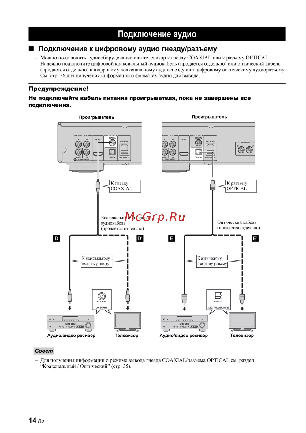 – Надежно подключите цифровой коаксиальный аудиокабель (продается отдельно) или оптический кабель