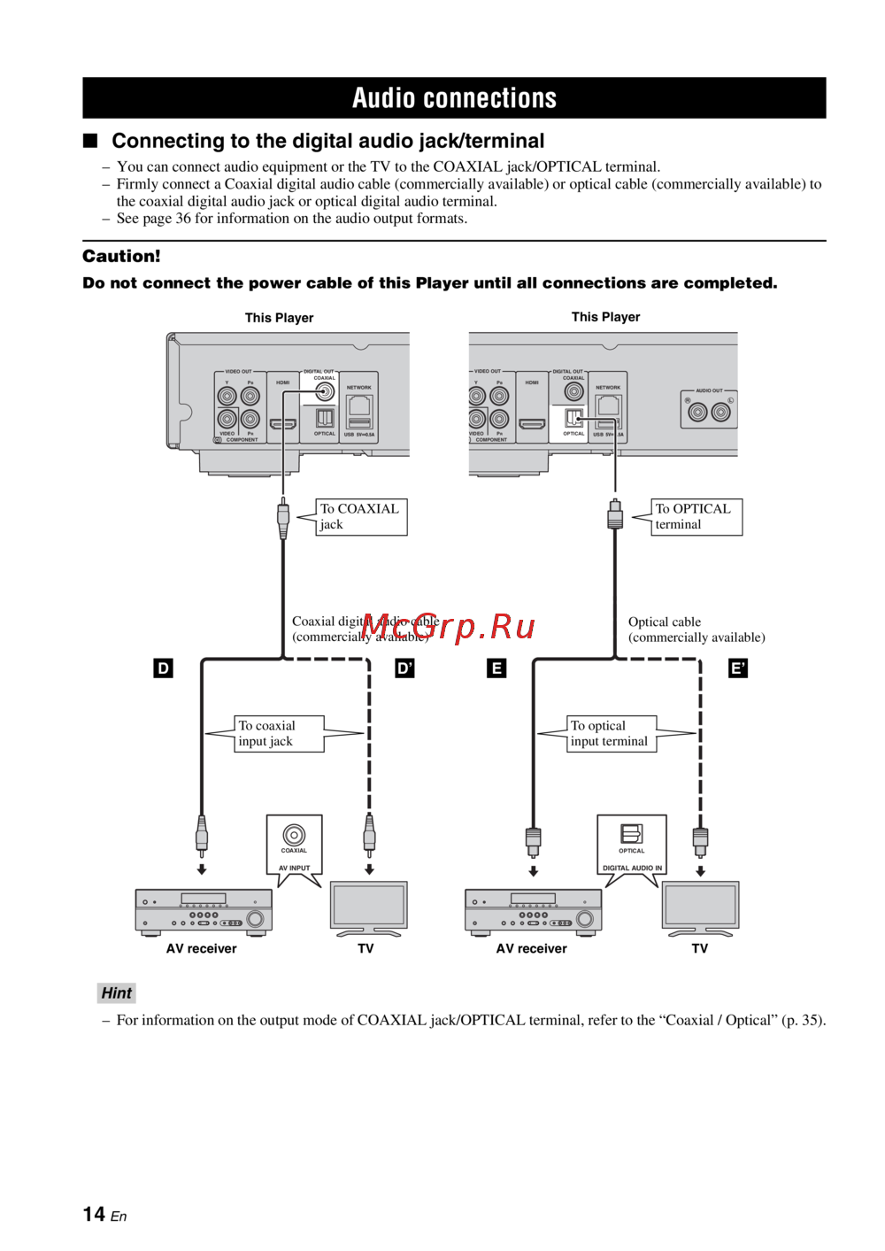 – Firmly connect a Coaxial digital audio cable (commercially available) or optical cable (commercially available) to