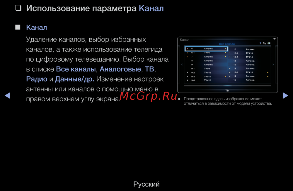 - Удаление каналов выбор избранных каналов а также использование телегида по цифровому телевещанию выбор канала в списке все каналы аналоговые тв радио и данные др изменение настроек антенны или каналов с помощью меню в правом верхнем углу экрана p.14