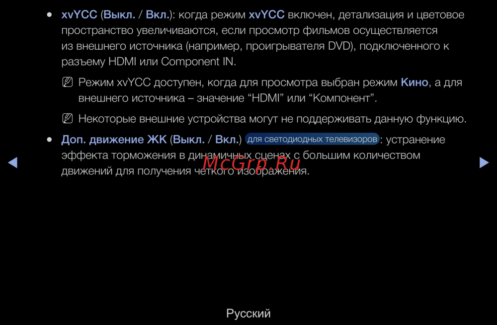 xvYCC (Выкл. / Вкл.): когда режим xvYCC включен, детализация и цветовое