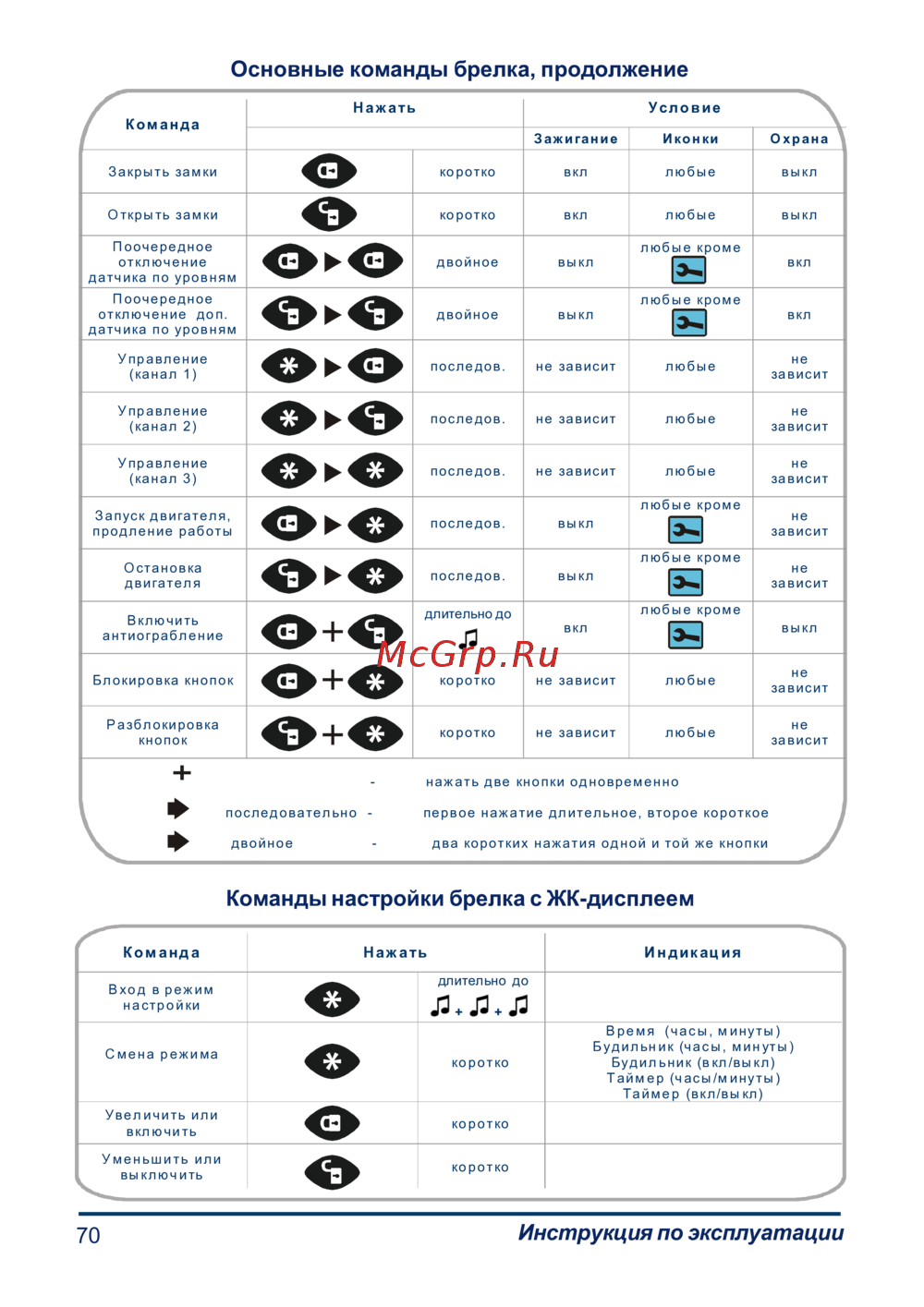 - Сводная таблица команд выполняемых брелка с жки p.69