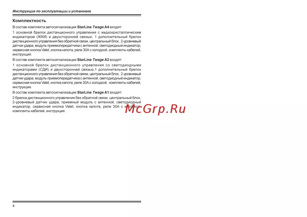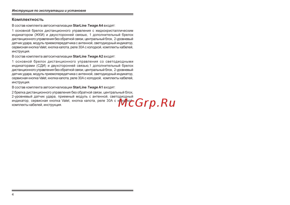 Инструкция по эксплуатации и установке Комплектность В состав комплекта автосигнализации StarLine Twage A4 входят 1 основной брелок дистанционного управления с жидкокристаллическим индикатором ЖКИ и двухсторонней связью 1 дополнительный брелок дистанционного управления без обратной связи центральный блок 2 уровневый датчикудара модуль приемопередатчика с антенной светодиодный индикатор сервисная кнопка Ælet кнопка капота реле ЗОА с колодкой комплекты кабелей инструкция В состав комплекта автосигнализации StarLine Twage А2 входят 1 основной брелок дистанционного управления со светодиодными индикаторами СДИ и двухсторонней связью 1 дополнительный брелок дистанционного управления без обратной связи центральный блок 2 уровневый датчикудара модуль приемопередатчика с антенной светодиодный индикатор сервисная кнопка Valet кнопка капота реле ЗОА с колодкой комплекты кабелей инструкция В состав комплекта автосигнализации StarLine Twage А1 входят 2 брелка дистанционного управления без обратной связи центральный блок 2 уровневый датчик удара приемный модуль с антенной светодиодный индикатор сервисная кнопка Valet кнопка капота реле ЗОА с колодкой комплекты кабелей инструкция 4