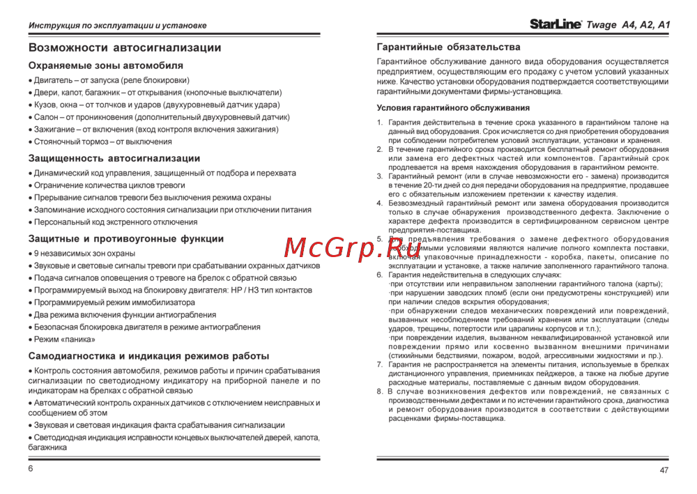 Starline A1 — инструкция по эксплуатации автосигнализации и гарантия [6/26]