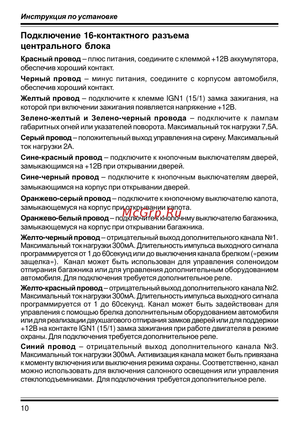 - Черно белый провод отрицательный выход блокировки двигателя нр нз контакты реле программируются максимальный ток нагрузки 300 ма для подключения требуется дополнительное реле p.11