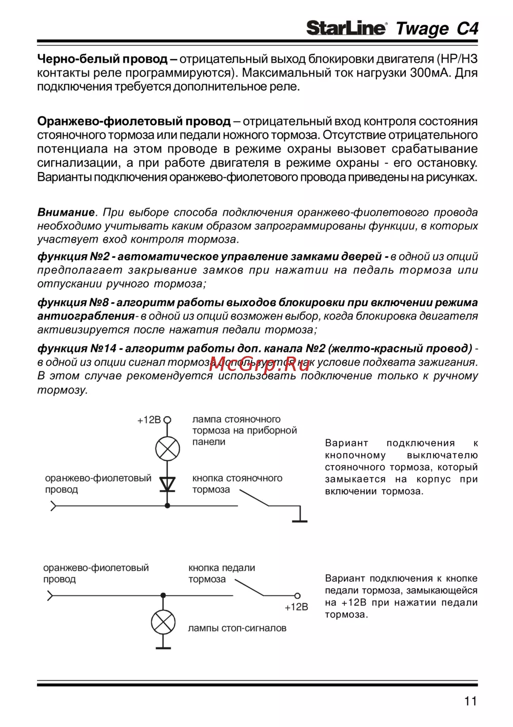 - Оранжево фиолетовый провод отрицательный вход контроля состояния стояночного тормоза или педали ножного тормоза отсутствие отрицательного потенциала на этом проводе в режиме охраны вызовет срабатывание сигнализации а при работе двигателя в режиме охраны его остановку варианты подключения оранжево фиолетового провода приведены на рисунках p.11