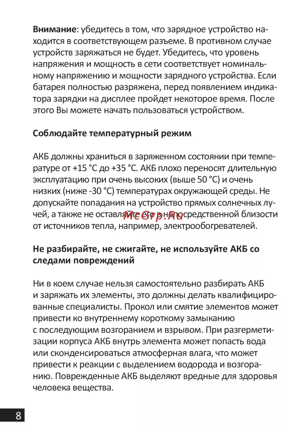 Не разбирайте, не сжигайте, не используйте АКБ со