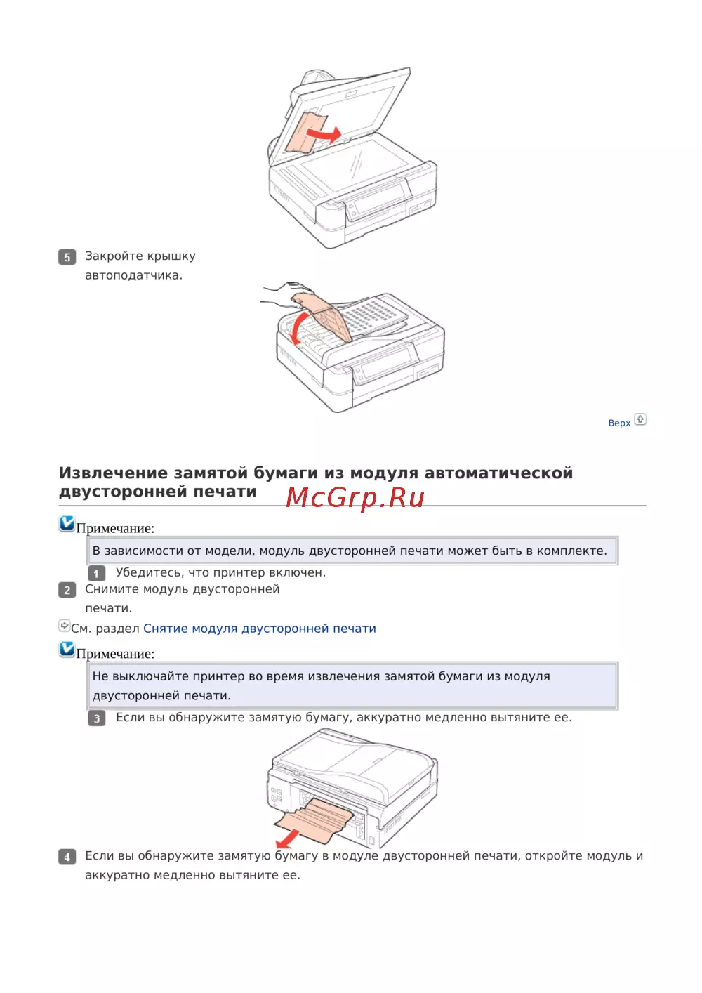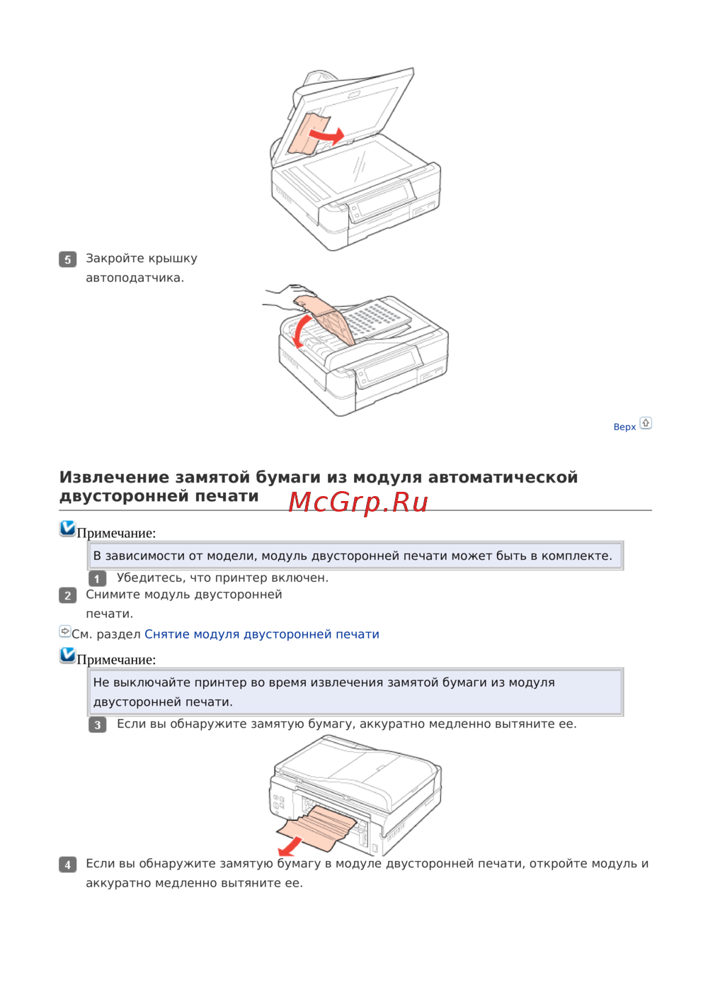 Не выключайте принтер во время извлечения замятой бумаги из модуля
