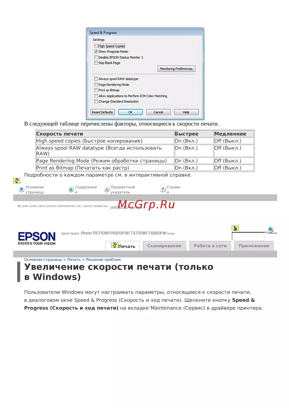 - Пользователи windows могут настраивать параметры относящиеся к скорости печати p.162