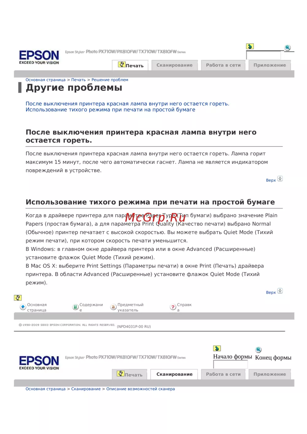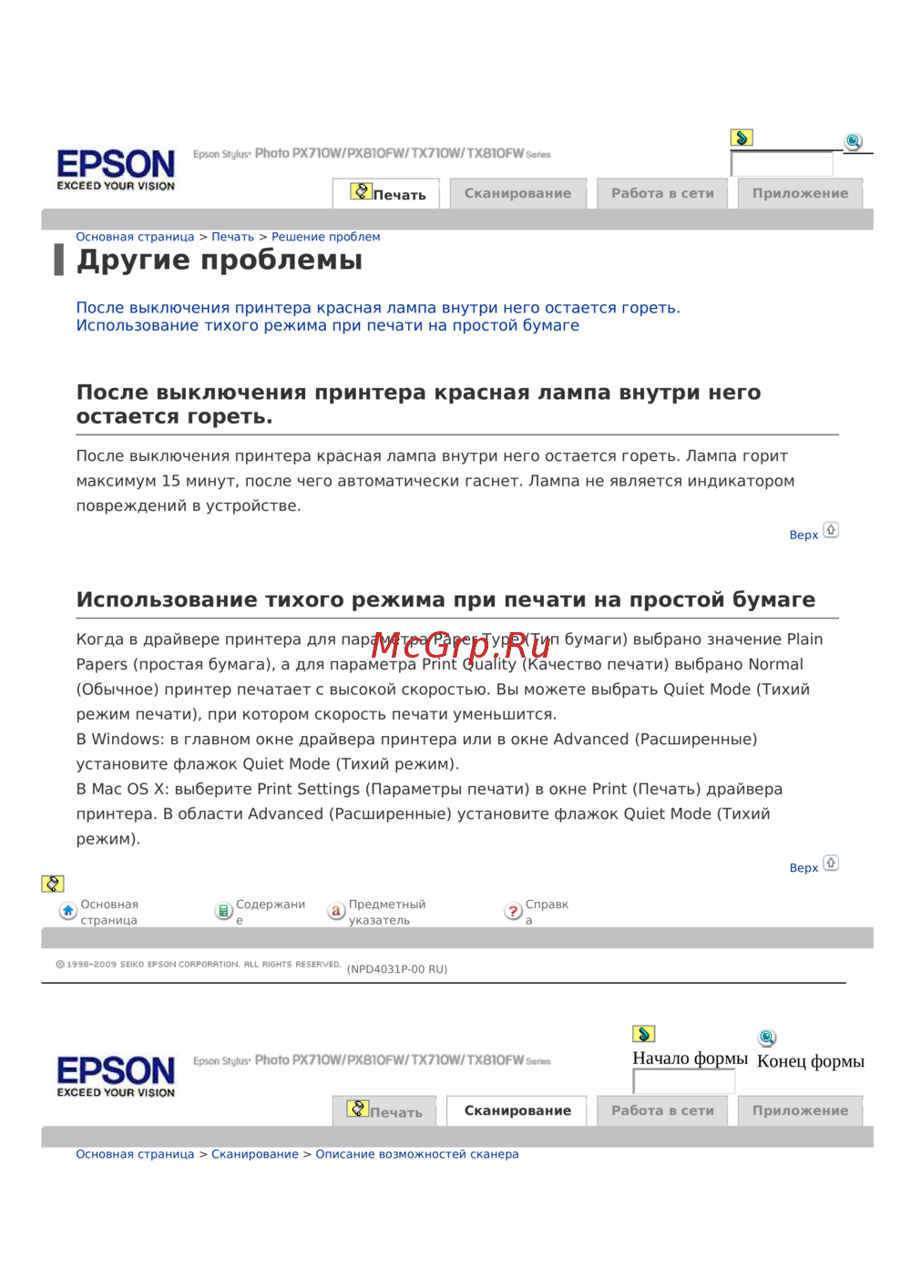 Epson TX710W [165/176] После выключения принтера красная лампа внутри него остается гореть использование тихого режима при печати на простой бумаге