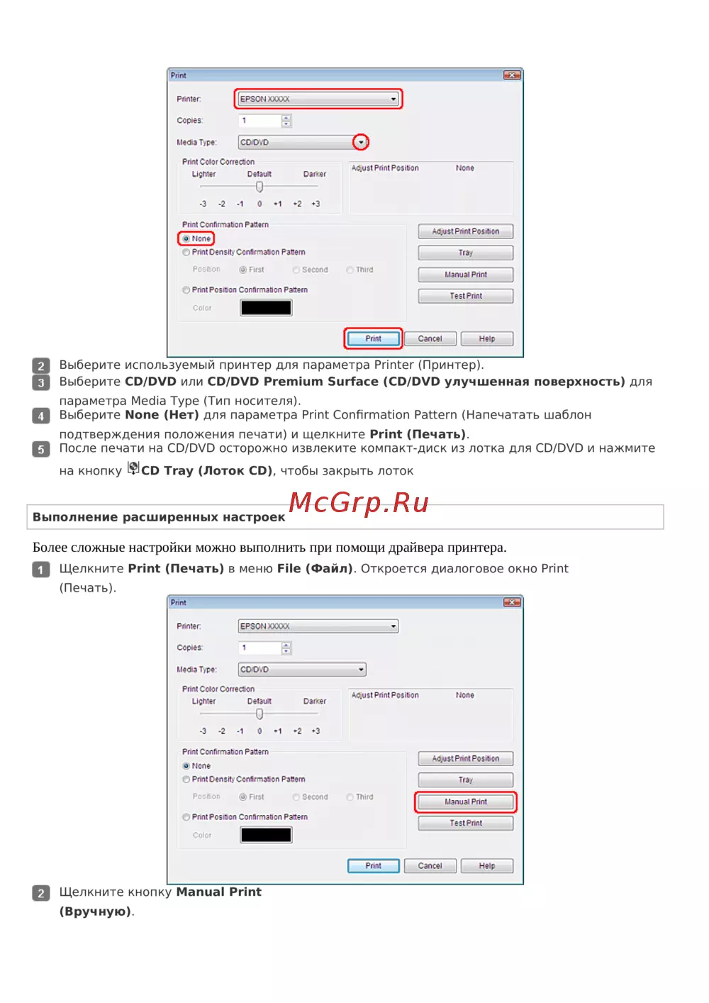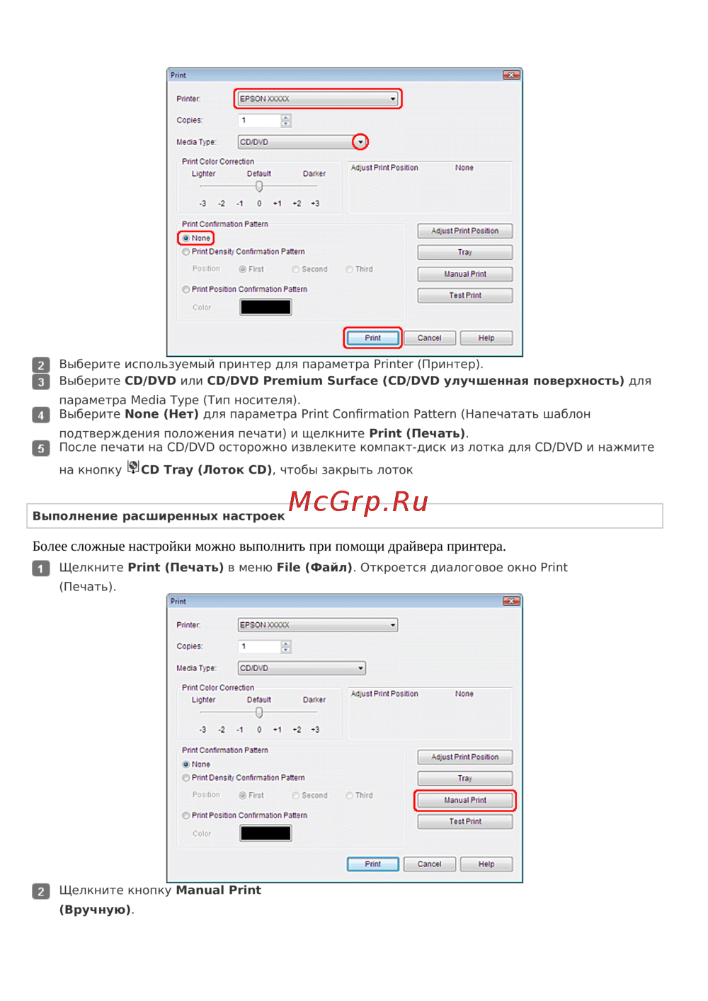 После печати на CD/DVD осторожно извлеките компакт-диск из лотка для CD/DVD и нажмите