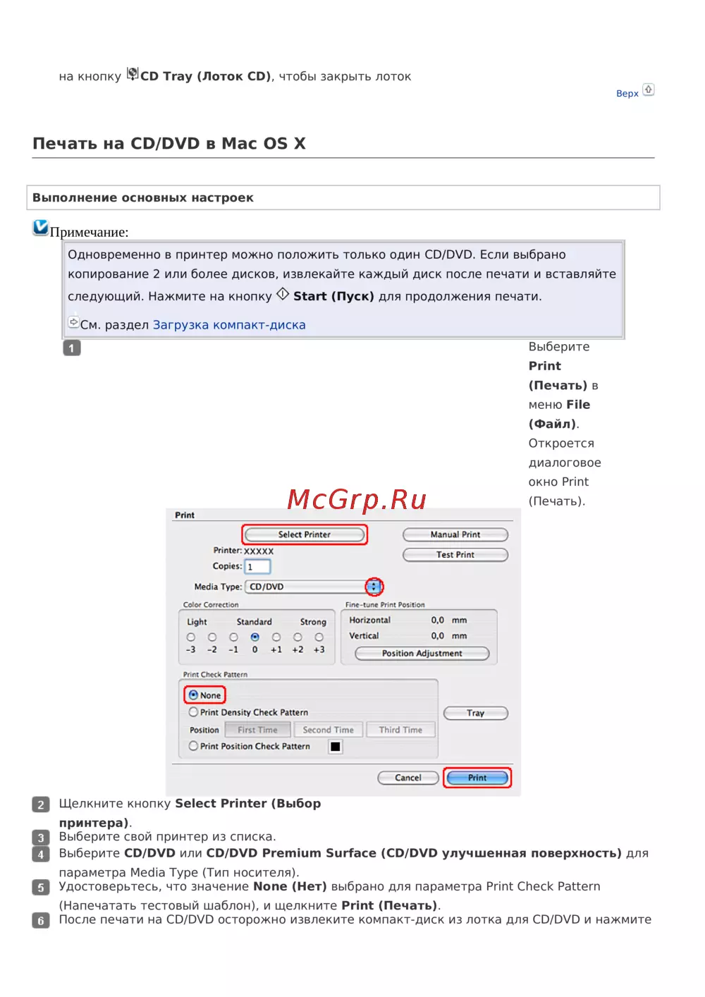 - В mac os x выберите print settings параметры печати в окне print печать драйвера p.165