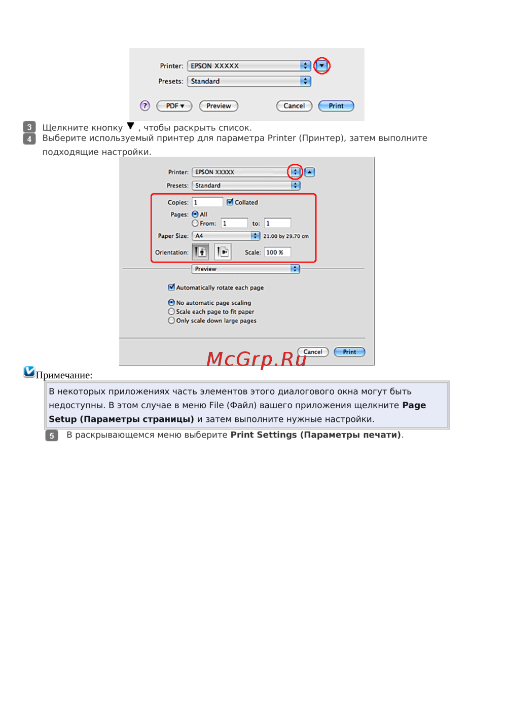 - В mac os x выберите print settings параметры печати в окне print печать драйвера p.165