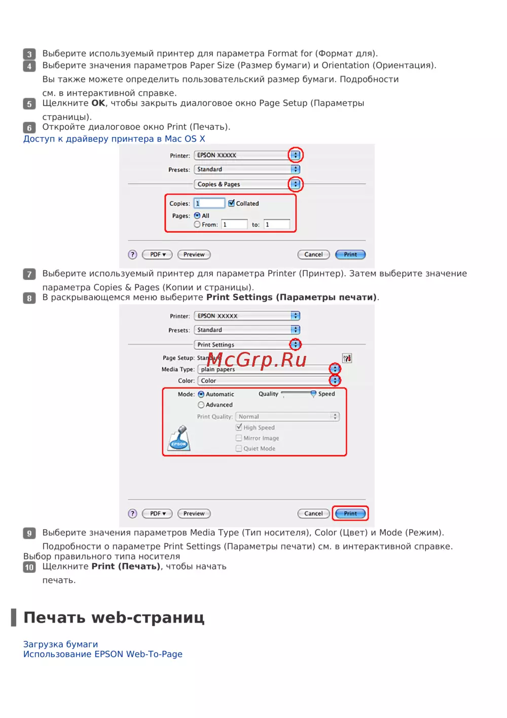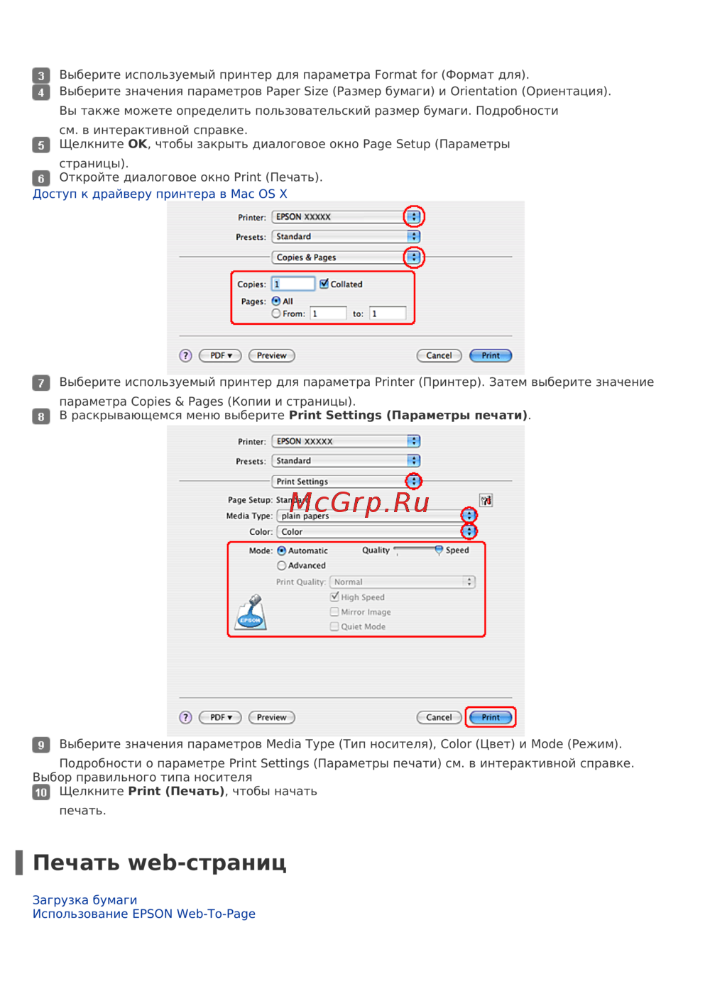 - В mac os x выберите print settings параметры печати в окне print печать драйвера p.165