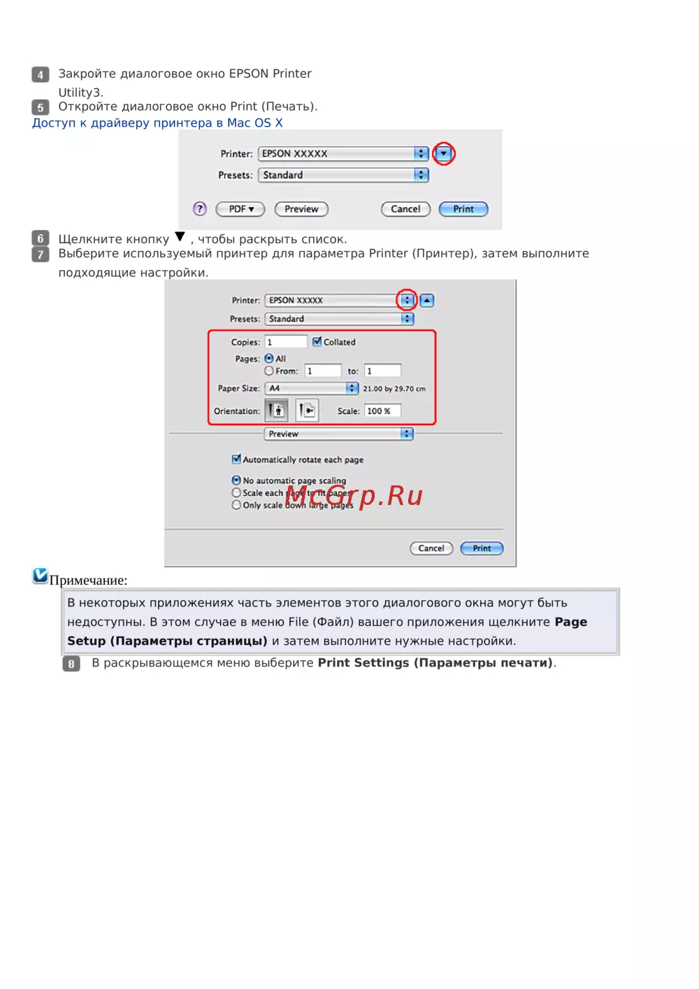 - В mac os x выберите print settings параметры печати в окне print печать драйвера p.165