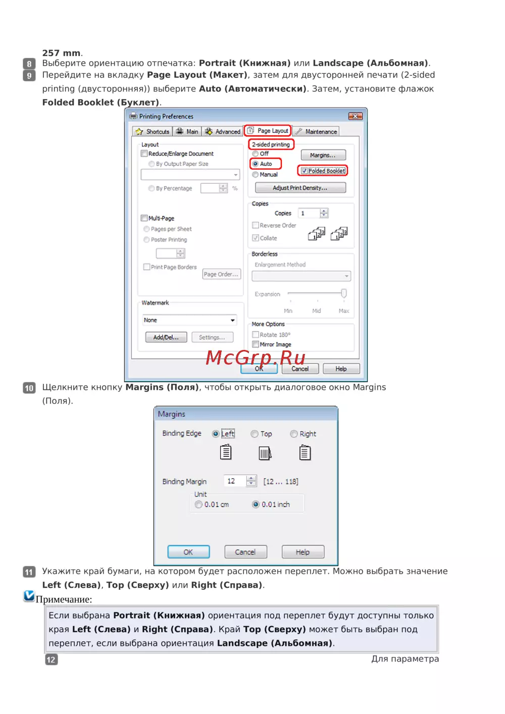 Есливыбрана Portrait (Книжная) ориентация под переплет будут доступны только