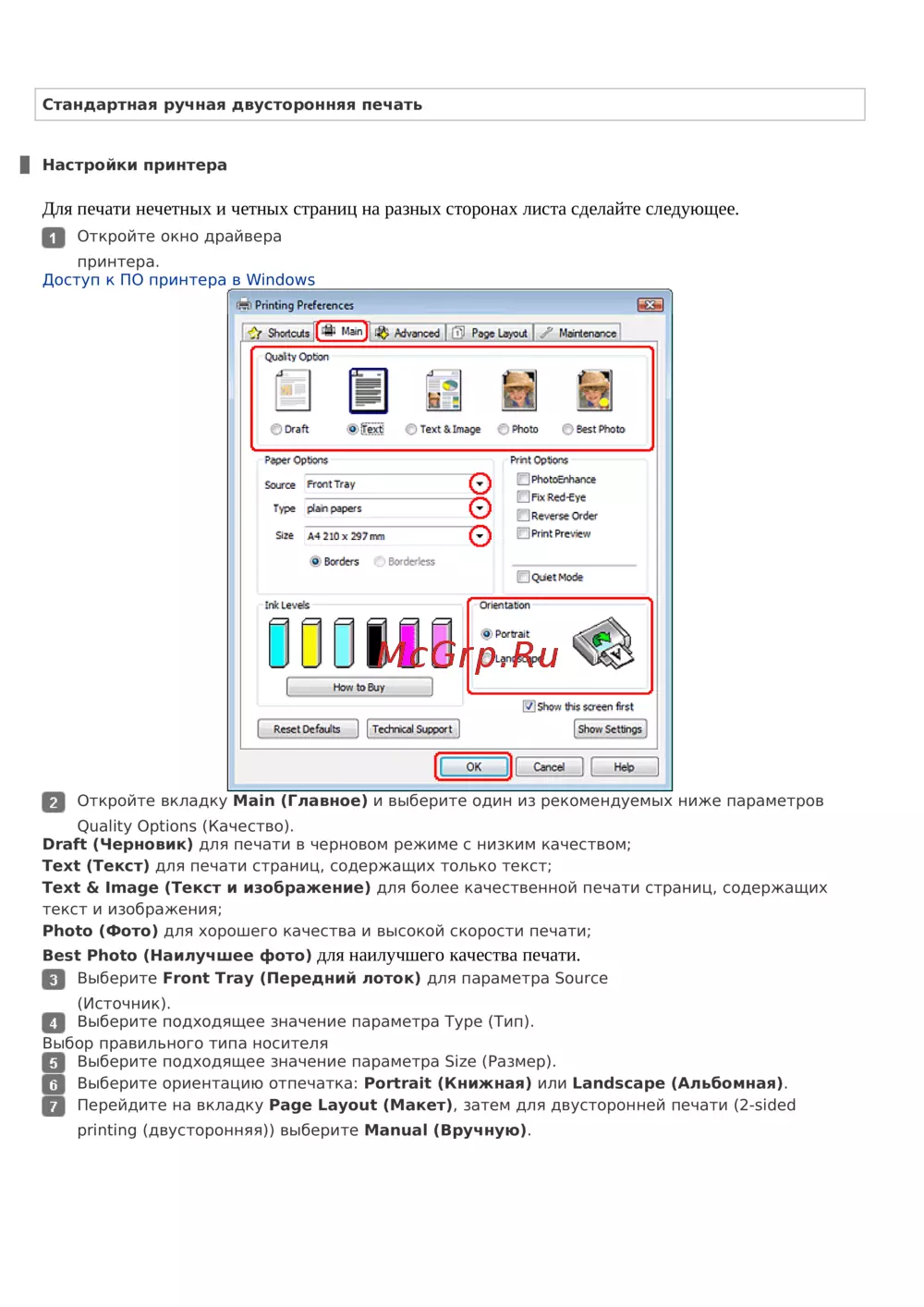- Papers простая бумага а для параметра print quality качество печати выбрано normal p.165