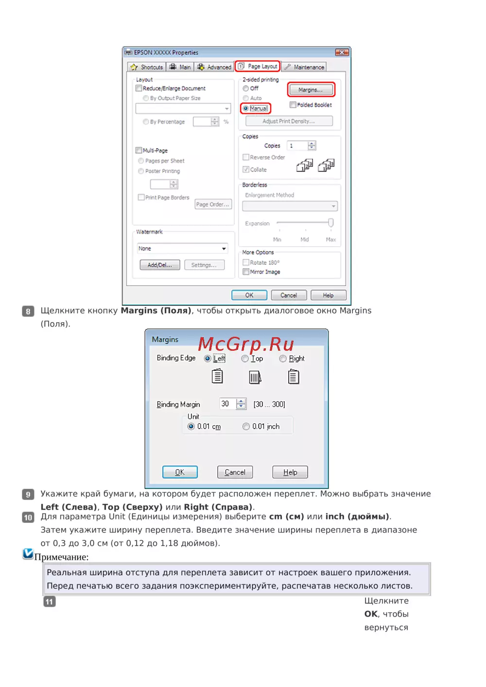 Укажите край бумаги, на котором будет расположен переплет. Можно выбрать значение