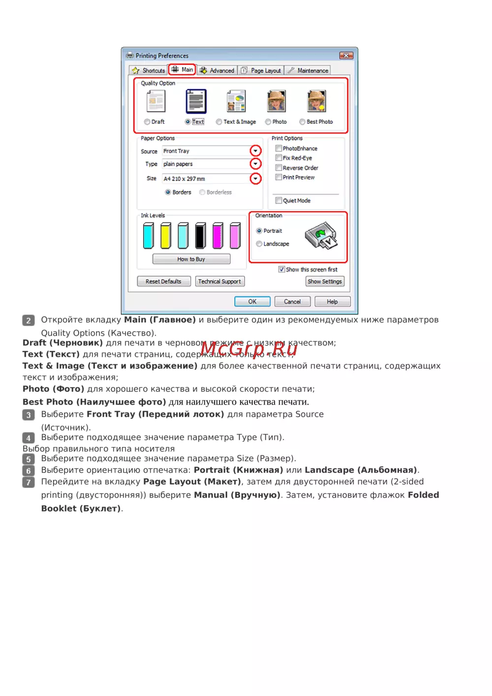 Выберите ориентацию отпечатка: Portrait (Книжная) или Landscape (Альбомная).
