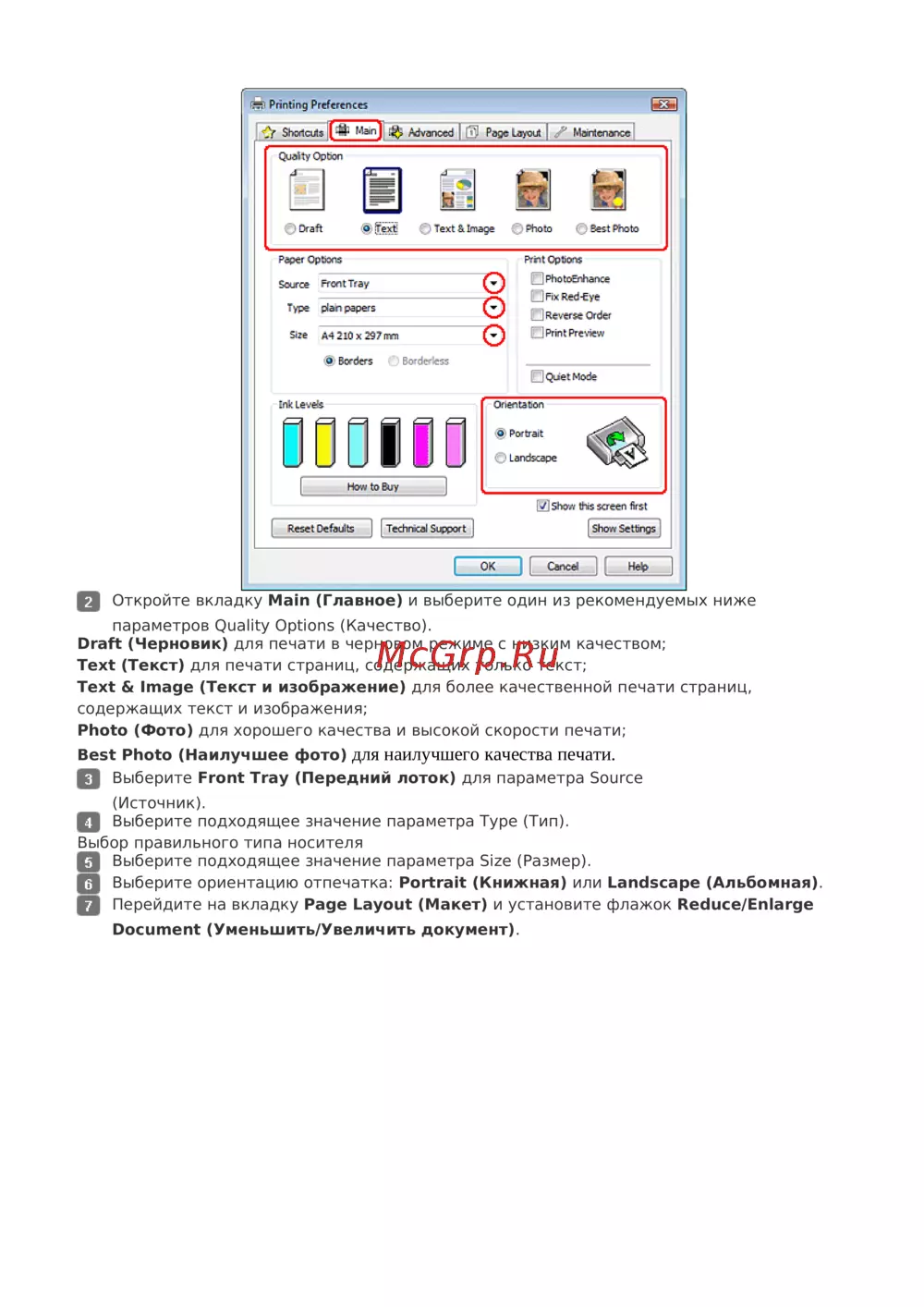 - Papers простая бумага а для параметра print quality качество печати выбрано normal p.165