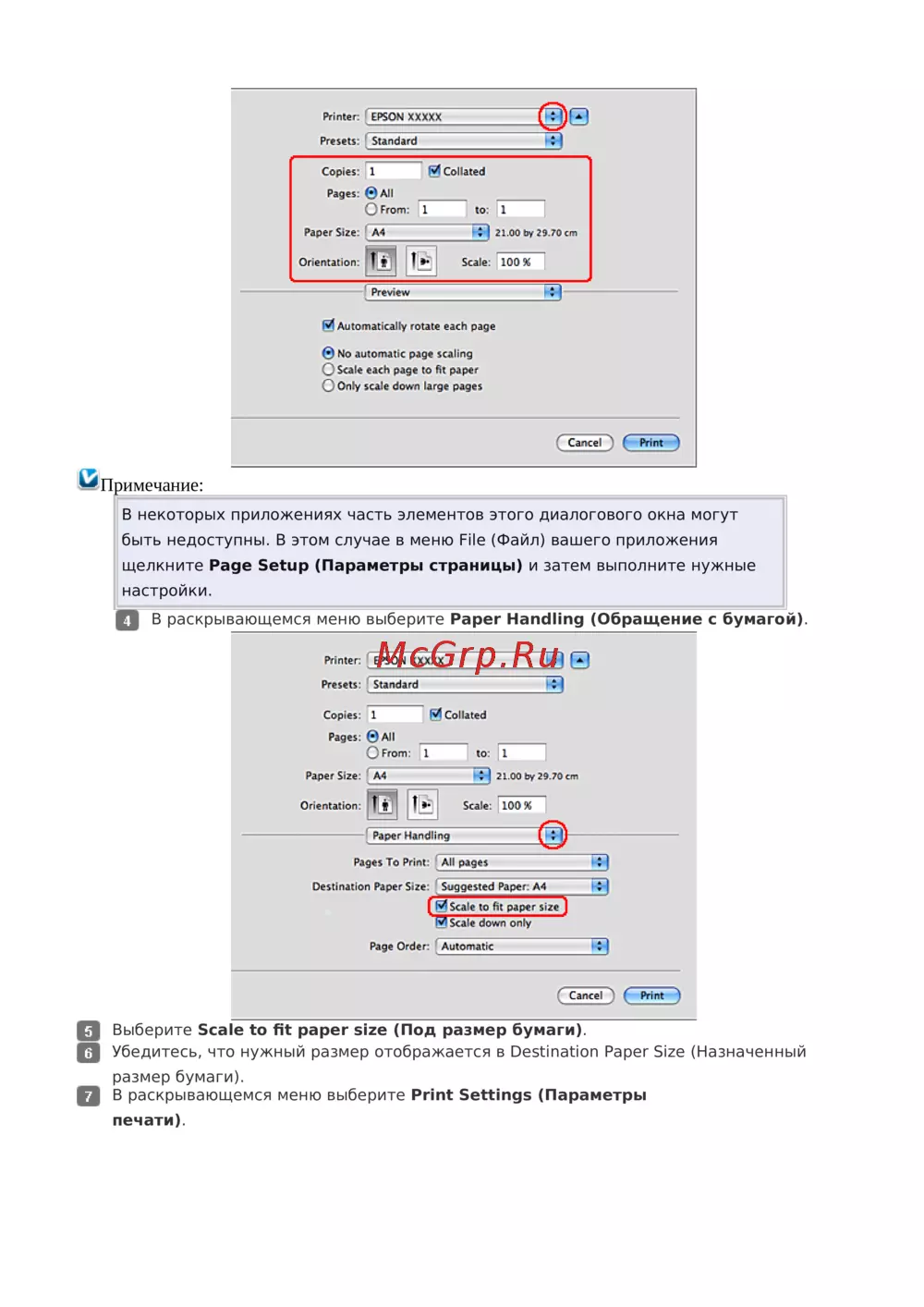 - В mac os x выберите print settings параметры печати в окне print печать драйвера p.165
