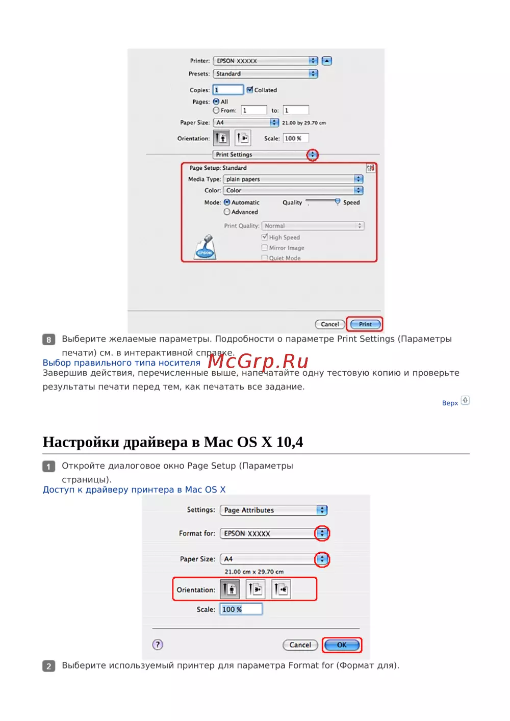 Настройки драйвера в)Mac OS X 10,4