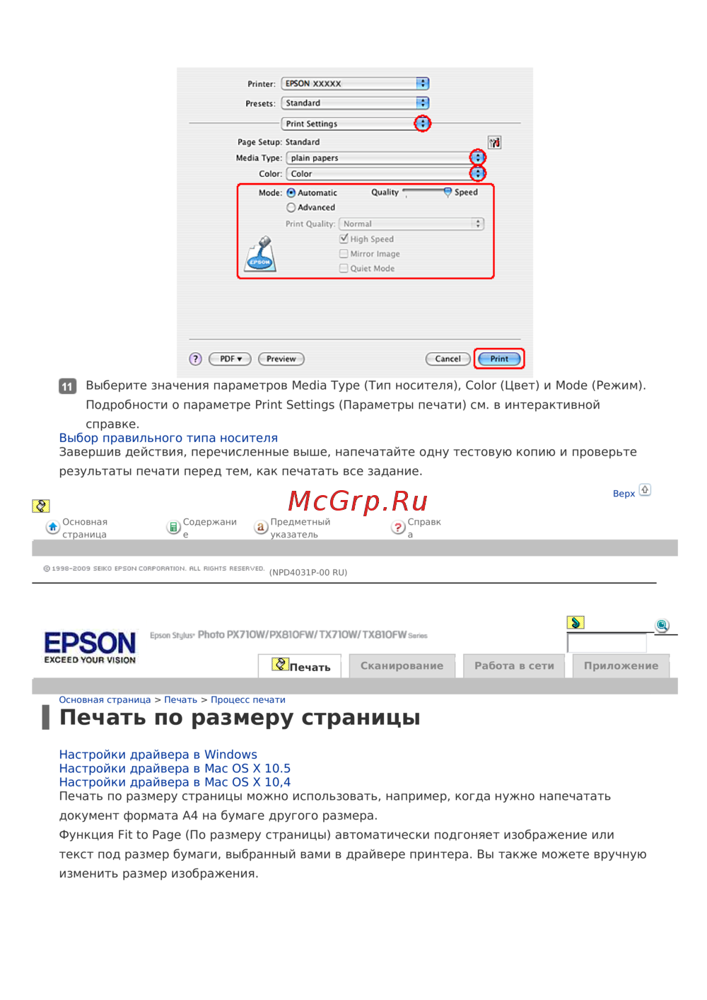 - В mac os x выберите print settings параметры печати в окне print печать драйвера p.165